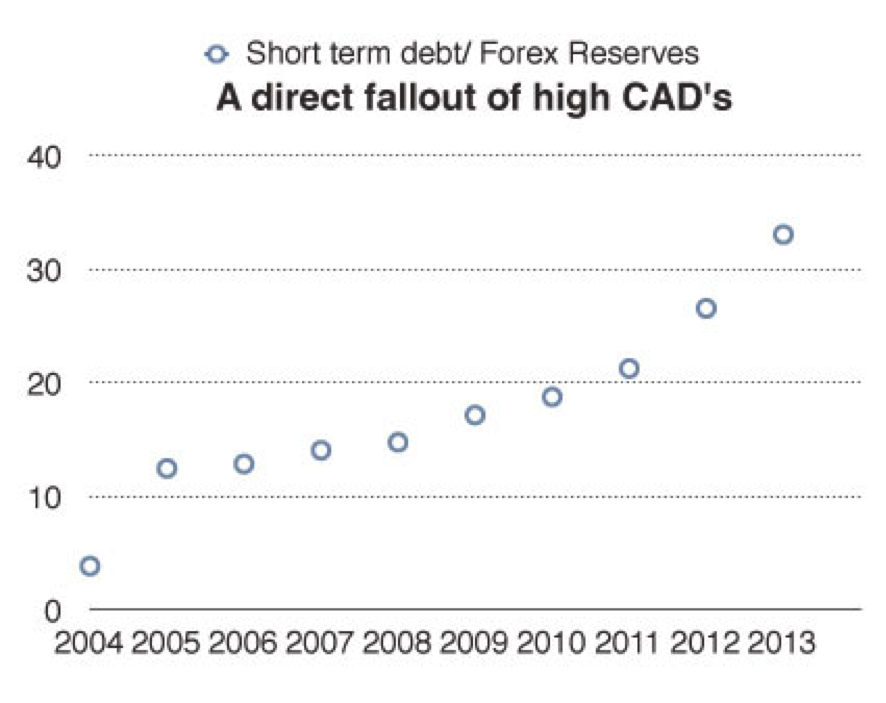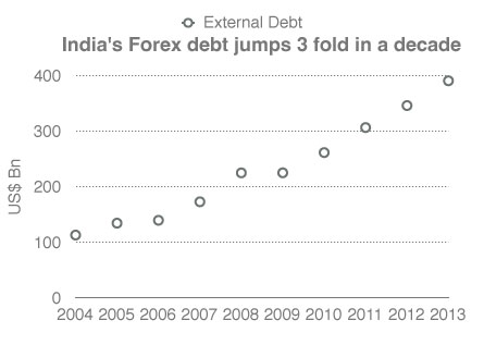Short term debts and the External Commercial Borrowings that would need repayment during this FY 2013-14 is high and would cause large outflow of dollars and put pressure on the currency intermittently. For example during May 22 and June 19 there was a net debt outflow of $4.7 billion, one of the prime reasons why Rupee tanked.